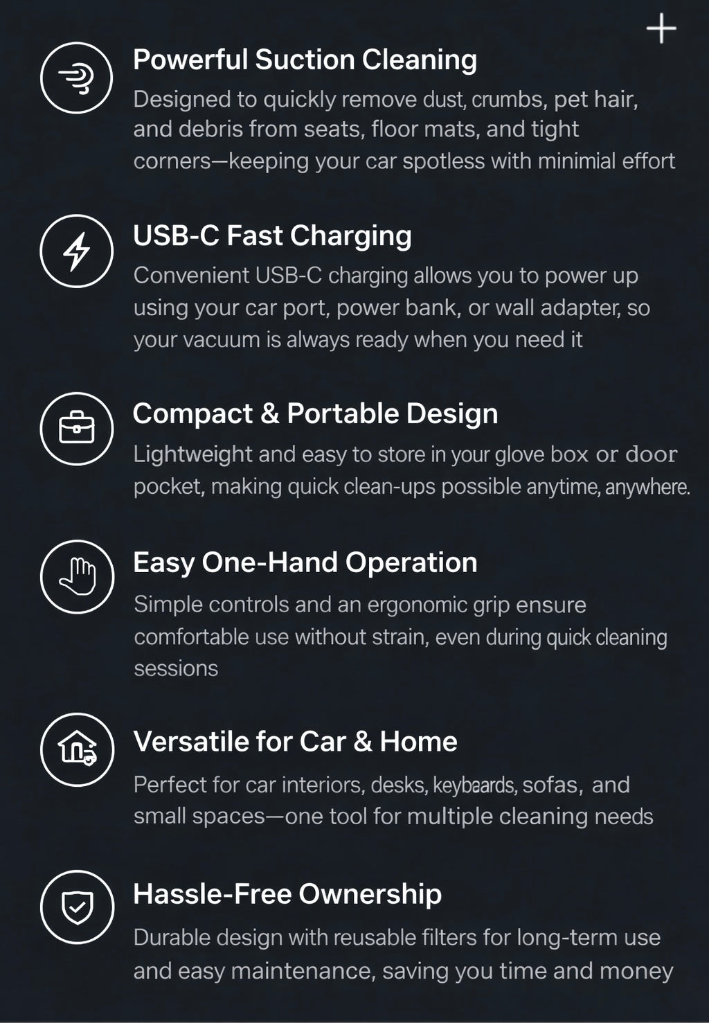 Because it’s small and lightweight, you can store it in your glove box or door pocket, making quick clean-ups effortless—whether it’s crumbs after a drive, dust on the dashboard, or sand from shoes. The powerful suction handles messes in hard-to-reach areas like seats, cup holders, and floor mats, saving you time and effort.